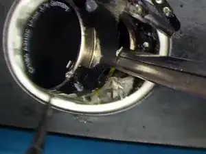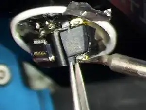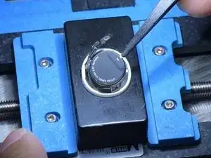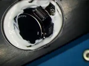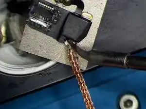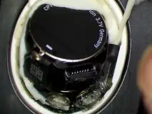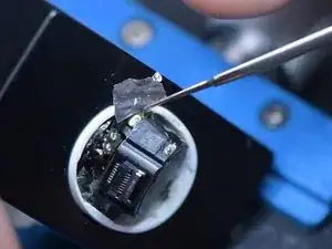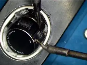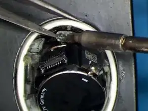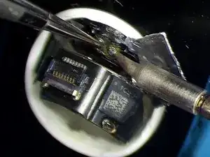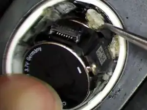 Удалите клей пинцетом в местах зазора. Обратите внимание на прикладываемую силу, чтобы не повредить гибкий кабель. Подденьте разъем и отсоедините гибкий кабель.