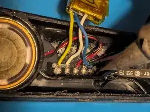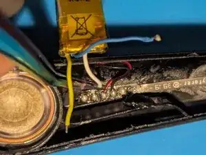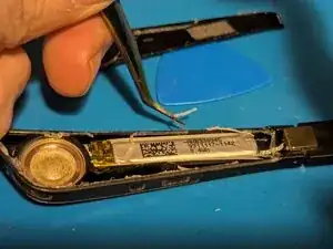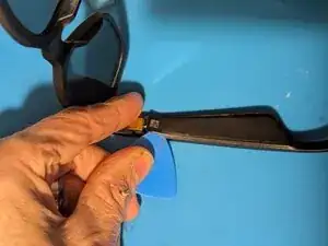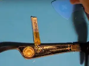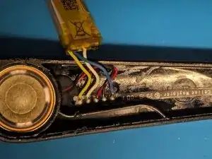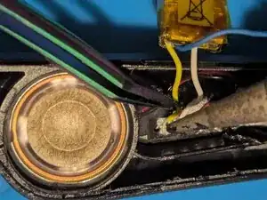 Аккумулятор слегка приклеен к наушнику с помощью двустороннего скотча на конце рядом с петлей. Приподнимите его с помощью открывалки.
