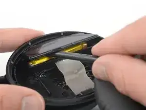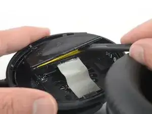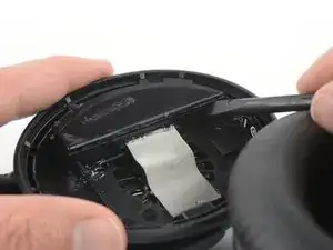 С помощью лопатки аккуратно отделите пластиковую крышку от чашки наушника. Избегайте чрезмерного давления на аккумулятор.