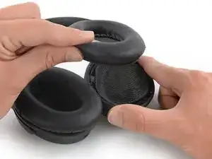 Возьмите амбушюр левого наушника и аккуратно потяните его к центру чашки, чтобы освободить от пластиковой защёлки, удерживающей его на месте.
