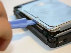 С помощью пластиковой лопатки подведите инструмент под нижний левый край жёсткого диска.