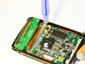 С помощью отвертки Phillips #00 выкрутите два винта длиной 1.5 мм, крепящие IDE-разъём к плате, расположенные в верхней части.