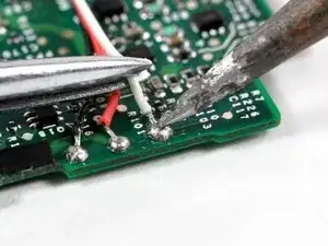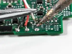 Начните с нагрева открытого конца белого провода батареи наконечником паяльника, одновременно оттягивая провод от контакта, удерживая провод за изоляцию пинцетом.