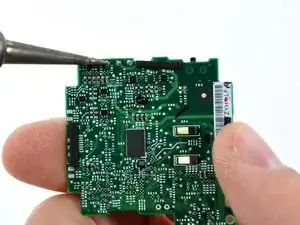 Чтобы открыть паяльные отверстия, разогните булавку и толкните её кончиком в припой, закупоривающий отверстие. Одновременно нагревайте ту же паяльную площадку с другой стороны платы логики. Полное открытие отверстий потребует повторения этой процедуры несколько раз с чередованием сторон платы логики.