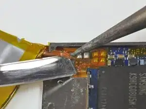 Аккумулятор в Nano четвёртого поколения подключён через контактные площадки для пайки со сквозными отверстиями, которые проходят через ленточный кабель аккумулятора и припаиваются к плоским контактным площадкам на поверхности платы логики. На этом шаге вы будете разогревать каждую контактную площадку по отдельности, одновременно поддев её металлической лопаткой, чтобы отсоединить от платы логики.