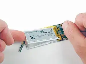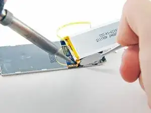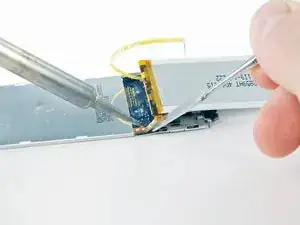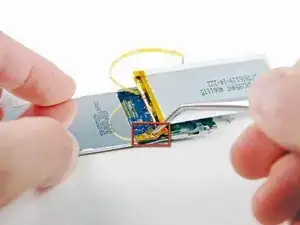С помощью пинцета снимите оранжевую ленту, закрывающую три пайки аккумулятора.