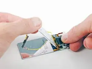 Пластина переключателя блокировки всё ещё прикреплена к iPod очень тонким, хрупким ленточным кабелем. Будьте осторожны, чтобы не повредить его.