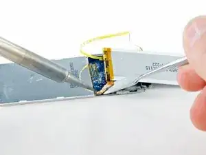 Начните работу с правой стороны ленточного кабеля аккумулятора. Нагрейте крайнюю правую контактную площадку и мягко подденьте снизу ленточный кабель, чтобы освободить его от платы.