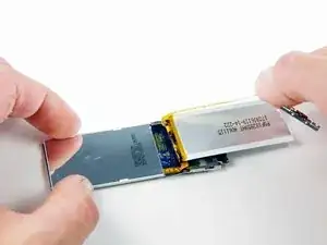 С верхней части iPod вставьте металлическую лопатку между внешним корпусом и аккумулятором, чтобы удалить клей, удерживающий аккумулятор на месте.