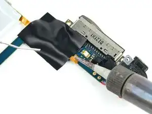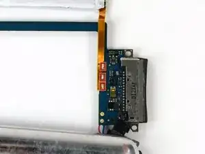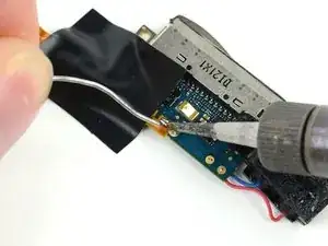 Батарея в плеере четвертого поколения подключена через контактные площадки с маленькими отверстиями, которые проходят через ленточный кабель батареи и крепятся к плоским площадкам на поверхности логической платы. В этом шаге Вы разогреете каждую контактную площадку по отдельности, одновременно поддев её металлической лопаткой, чтобы освободить от платы.