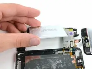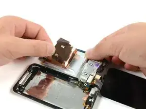 Также кабель данных дисплея очень короткий и подключён к логической плате примерно у верхней части передней панели. Если он не отсоединится при освобождении верхнего края передней панели, обязательно отсоедините его с помощью инструмента для вскрытия iPod перед поворотом передней панели наружу.