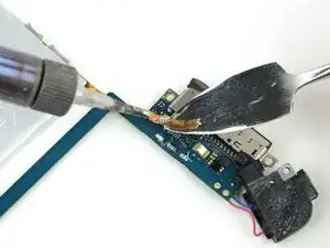 Чтобы не согнуть и не сломать логическую плату, пока не пытайтесь её снимать. Разъём дока всё ещё закреплён в рамке. Опять же, Вы только ослабляете клей.