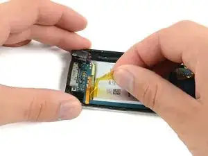 Используйте инструмент для вскрытия iPod, чтобы слегка приподнять край логической платы рядом с батареей настолько, чтобы схватить её другой рукой.