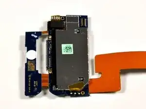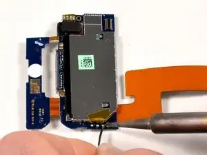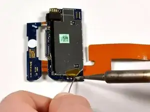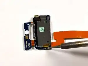 Плату антенной петли нужно приподнять (она приклеена). Осторожно используйте пластиковый инструмент для вскрытия или лопатку, чтобы отодрать плату антенной петли. Плата соединена с антенной электроникой небольшим шлейфом. Этот двухплатный узел очень хрупок.