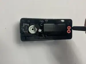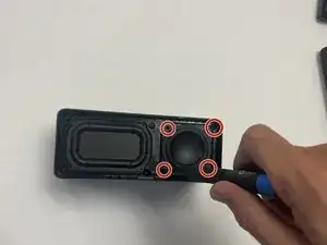 Выпрямите обе заглушки на передней и задней стороне динамика, чтобы обнажить винты для доступа внутрь корпуса.