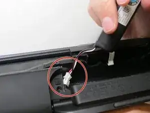 Используйте пластиковую лопатку, чтобы пройти по внешним краям динамика. Подденьте по швам, пока не сможете снять боковую панель динамика, открывая доступ к аккумулятору.