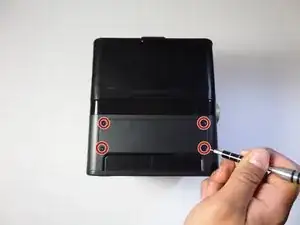 Переверните TDK Life on Record Trek 360 на бок, как показано, и удалите четыре винта по 8 мм, удерживающих крышку батареи, с помощью битки T-5.