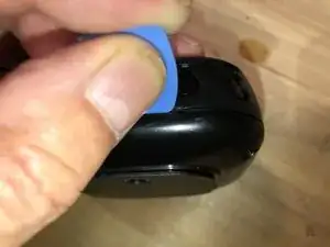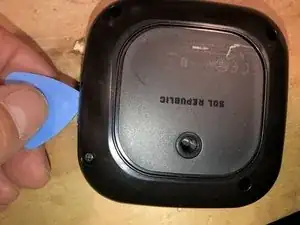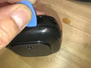 После снятия прокладки и решётки вставьте инструмент для вскрытия (например, медиатор) между двумя половинками корпуса Punk. Между половинками корпуса нанесён клей, поэтому может потребоваться небольшое усилие и покачивающие движения.