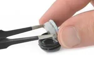 Используйте пинцет с притуплёнными концами, чтобы вынуть корпус аккумулятора, удерживая верхнюю часть пальцами.