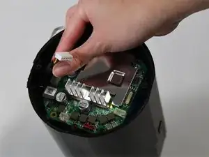 Поднимите серую решётку динамика, чтобы открыть доступ к чёрному пластиковому цилиндру, в котором находится аккумулятор.