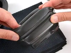 Крепко удерживая верхнюю часть амбушюра на месте, протяните остальную часть тканевой лапки над краем, обрабатывая всю чашку. Осторожно растягивайте амбушюр по мере необходимости.