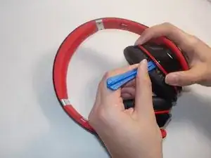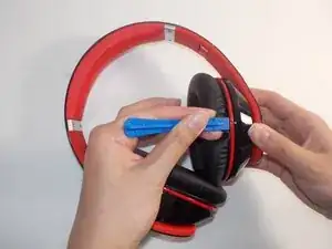 Поместите инструмент для открывания iFixit между мягким амбушюром и твердым пластиком динамика.