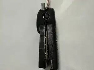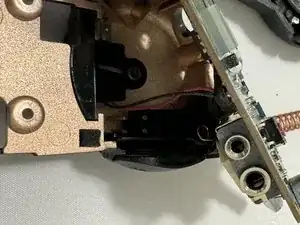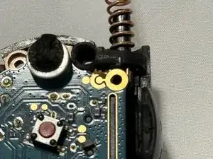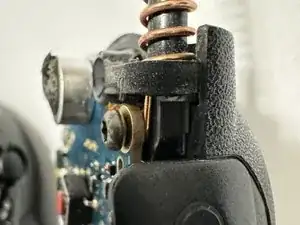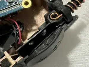 В верхней левой части задней половины корпуса есть небольшой штифт, который входит в отверстие на плате. Может быть немного сложно совместить его при одновременном возвращении регулятора громкости на место.