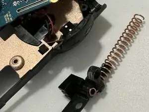 В левом верхнем углу есть небольшой металлический штифт, держащий плату. Когда вы поднимете достаточно, чтобы освободить его, вы сможете потянуть вниз и вынуть регулятор громкости из его отверстия.