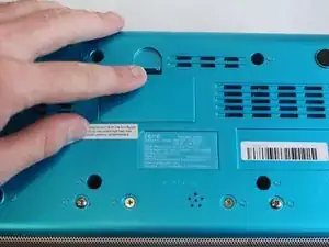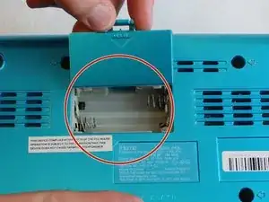 С помощью пальца подденьте язычок крышки отсека для батареек, чтобы снять крышку на задней части iHome и получить доступ к батарейкам.