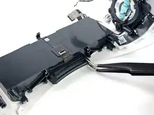 Используйте лопатку, чтобы поддеть чёрную защёлку, фиксирующую кабель левого микрофона к левому соединительному кабелю.