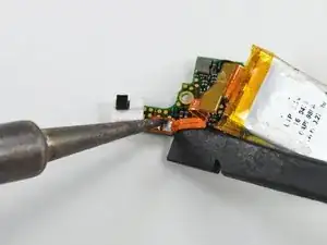 Батарея на Shuffle подпаяна к плате через контактные площадки с небольшими отверстиями, проходящими через ленту батареи и соединяющимися с плоскими контактами на лицевой стороне логической платы. На следующих шагах вы будете поочередно разогревать каждую контактную площадку и поддевать её лопаткой, чтобы отделить от платы.