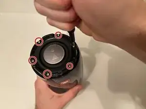 Выверните шесть винтов Phillips #1 длиной 8 мм с конца колонки с решеткой и надписью "JBL".