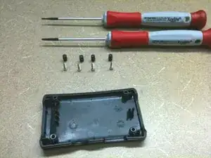 На задней стороне четыре резиновые заглушки. Снимите их и найдите винты с крестообразным шлицем.