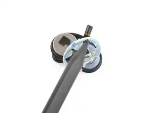 Поместите кончик медиатора для вскрытия между пластиковыми корпусами на изогнутой внутренней стороне наушника.