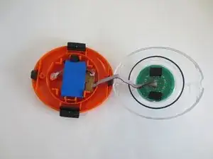 Установите батарею в оранжевой компонент так, чтобы короткий конец батарейного блока касался поролонового бампера.