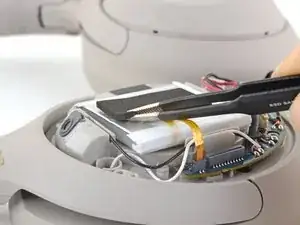 Используйте пинцет, чтобы захватить края разъёма батареи и потянуть вверх, чтобы отключить его от основной платы. При необходимости подденьте разъём или «шагающими» движениями разведите лапки пинцета в стороны, чтобы освободить разъём из гнезда.