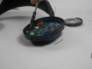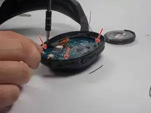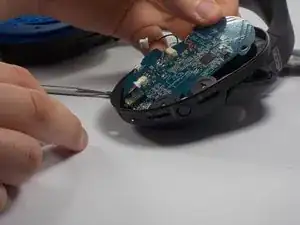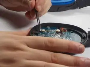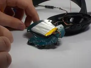 Осторожно удалите и переверните плату, чтобы открыть доступ к батарейному блоку, прикрепленному к нижней стороне. Будьте осторожны, чтобы не выдернуть провода, проходящие через оголовье.