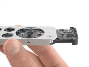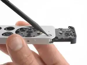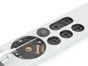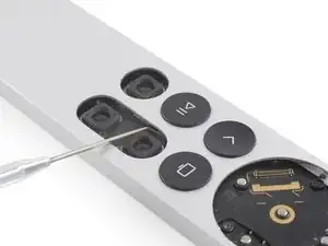 Используйте отвертку T3 Torx, чтобы выкрутить два винта длиной 4,7 мм, фиксирующие кнопку Siri на правом краю пульта.