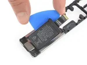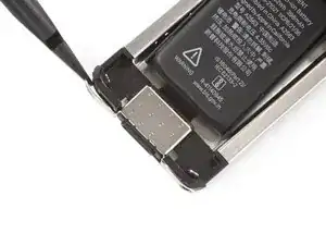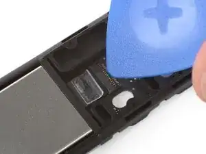 Плоским концом лопатки сдвиньте узел разъёма аккумулятора в сторону нижней части рамки, чтобы освободить удерживающие его металлические защёлки.