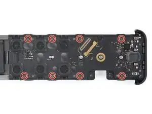 Отверткой Torx T3 выкрутите восемь винтов длиной 4,7 мм, фиксирующих плату к рамке.