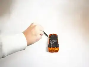 Используйте отвертку JIS #1, чтобы отвинтить единственный винт, который фиксирует крышку батарейного отсека внизу автомобиля.