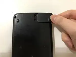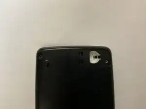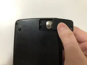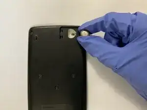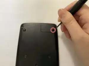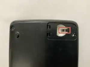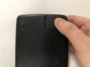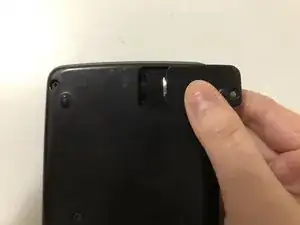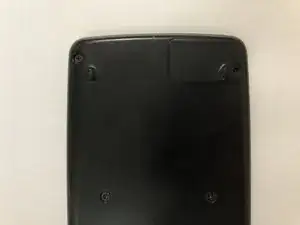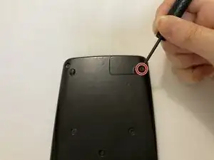 Положите калькулятор лицевой стороной вниз, затем используйте отвёртку Phillips #00, чтобы вынуть единственный винт, фиксирующий крышку батарейного отсека в правом верхнем углу.