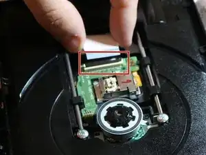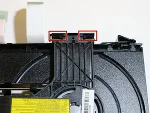 Найдите две чёрные защёлки в конце чёрной планки через лоток для диска. Защёлки находятся на противоположной стороне от пружины.