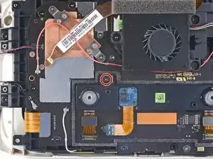 Один из винтов будет закрыт наклейкой, показывающей вскрытие. Протолкните отвёртку через наклейку, чтобы вынуть винт.