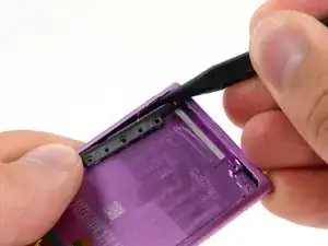 Используя острый конец лопатки, подденьте сборку кнопок регулировки громкости, отводя её от края корпуса.