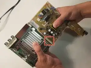 Находится в месте, помеченном красным прямоугольником, где они подключены. Удерживайте материнскую плату в одной руке, а блок питания — в другой, поднимите материнскую плату вверх и нажмите блок питания вниз. Материнская плата и блок питания должны отсоединиться.