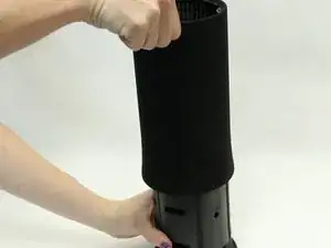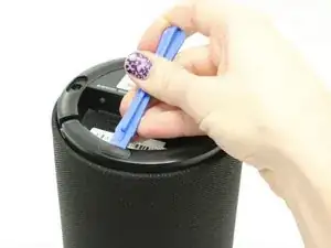 Снимите решетку динамика, зафиксировав колонку на столе и надавив на нижнюю часть колонки. Сдвиньте решетку вверх и отведите от оставшегося торцевого элемента.