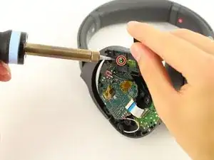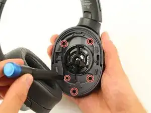 Затем переверните наушник и аккуратно снимите пластиковую крышку, чтобы открыть доступ к внутренним компонентам левого наушника.