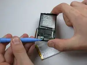 Между аккумулятором и устройством имеется клей, поэтому используйте металлическую лопатку, чтобы полностью оторвать аккумулятор.