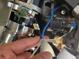 Используйте острый инструмент, чтобы разрезать пластиковую стяжку, фиксирующую кабели цветового диска.